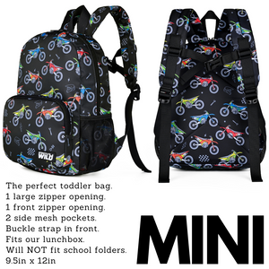 Small but mighty, our mini backpack is made for busy days and little racers on the go. It features one large compartment and a front pocket for essentials, with a sleeve to secure important items. Two mesh water bottle holders keep hydration close, and the compact size makes it perfect for toddlers, travel, or quick rides.