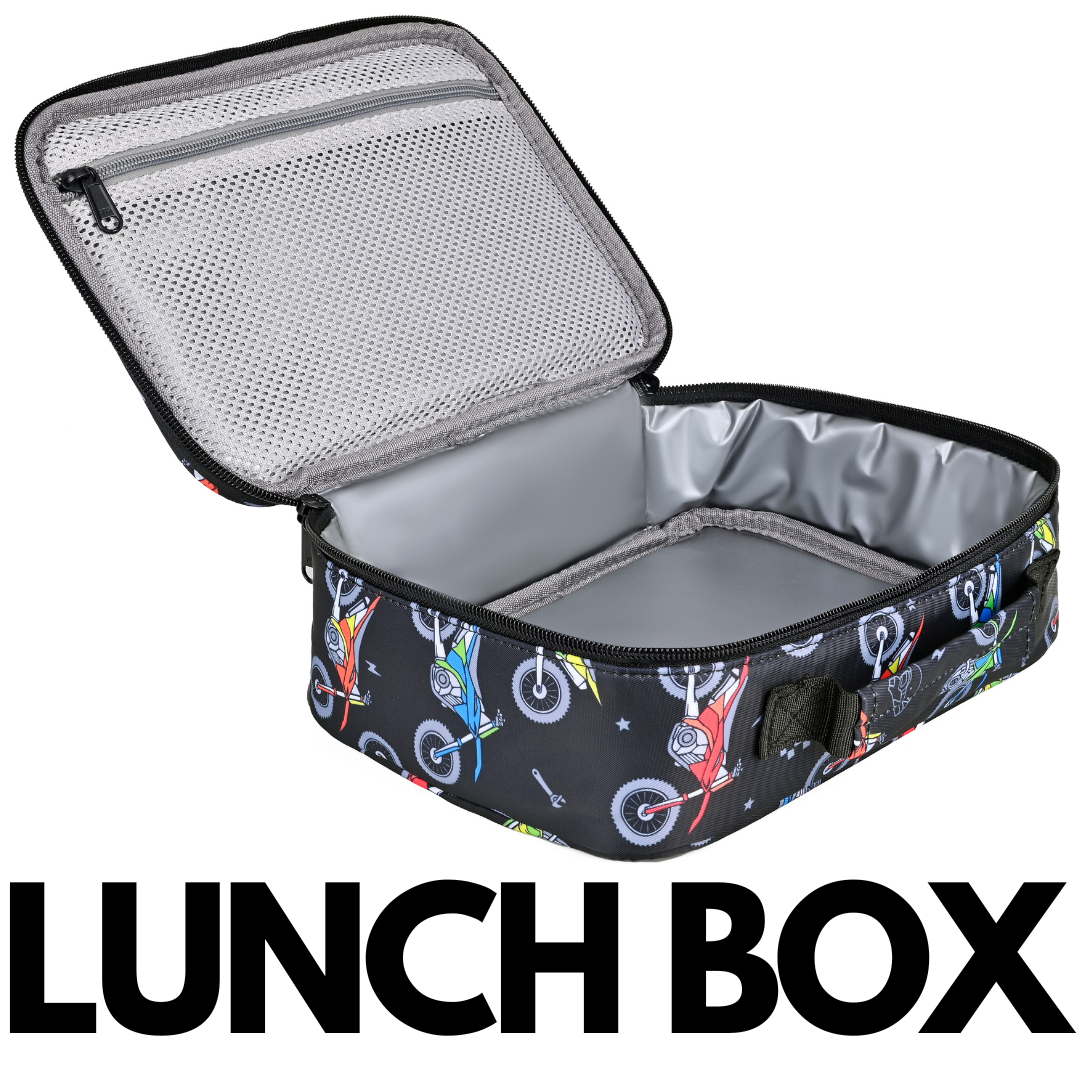 Keep snacks cool and fresh all day with our insulated lunchbox, built for both school and race days. It features a zip closure for quick packing and a separate inner pouch for utensils or condiments. The sturdy structure keeps your food safe, while the moto-inspired style turns every meal into an adventure.