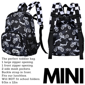 For the little ones or those on-the-go, our mini backpack is the perfect companion. It features one large opening and a front zipper pocket, providing enough space for your toddler's essentials or as a compact travel bag. Inside, you'll find a sleeve opening to keep important items secure. Plus, it has two mesh water bottle holders to keep your little one hydrated.