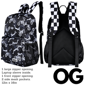 Ready to tackle the school day? Our OG backpack is designed to hold folders, binders, and all your school essentials. It boasts one large opening and a front opening for easy access to your belongings. With a comfortable back, it's ready to handle even the heaviest textbooks. This backpack also features two mesh water bottle holders to keep you refreshed throughout the day.