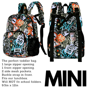 For the little ones or those on-the-go, our mini backpack is the perfect companion. It features one large opening and a front zipper pocket, providing enough space for your toddler's essentials or as a compact travel bag. Inside, you'll find a sleeve opening to keep important items secure. Plus, it has two mesh water bottle holders to keep your little one hydrated.